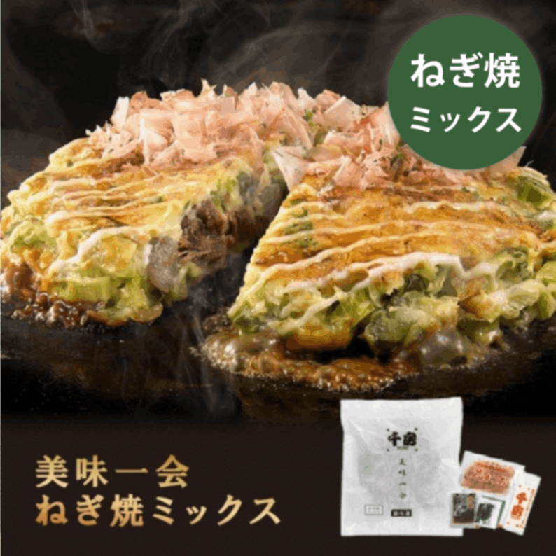 内容量:ねぎ焼200g×1枚、醬油たれ10g、ホワイトソース10g、あおさのり0.2g、かつお節1g×各1袋